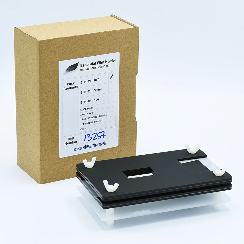 The Essential Film Holder (EFH) is a simple, effective and affordable solution for holding film strips above a light box in a perfectly flat way and aligned with your digital camera. It considered by many as the the best solution price-quality for digitizing film with a digital camera (also called camera scanning). It holds 35mm and 120 film negative super flat resulting in distortion free, high-quality digital (raw) files. For converting the scanned negatives, we advise using the Negative Lab Pro software.