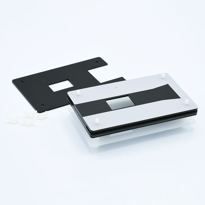 Complete Essential Film Holder (version 3) with standard film mask for digitizing 35mm film negatives (without sprockets) and 120 film negatives (without borders). System always expandable with optional film masks. Use of a lightbox like the Kaiser Slimlite is necessary. Copying stand optional and recommended for larger volumes of film to be digitized.