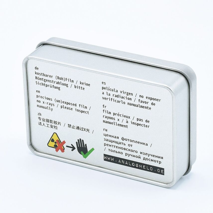 Cette solide boîte de 120 films vous permet de ranger vos films en bobine en toute sécurité lors d'un voyage près de chez vous mais aussi pour des aventures dans des régions éloignées. Voyager avec des films devient de plus en plus difficile car de nombreux aéroports dans le monde entier installent des scanners CT qui sont très dangereux pour les films (non) exposés, même s'ils sont stockés en toute sécurité dans un boîtier comme celui-ci. C'est pourquoi le fond de la boîte de film est équipé d'un avertissement pratique indiquant de vérifier le film à la main en six langues : anglais, allemand, espagnol, français, russe et chinois (mandarin).