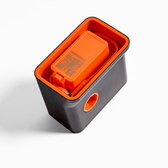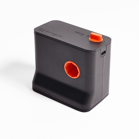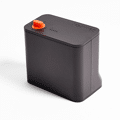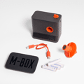 Le design du produit rappelle celui du Lab-Box, avec son élégant noir mat rehaussé d'inserts orange, compact et portable. Le dessus du M-Box comporte le bouton d'alimentation et de sélection des programmes, ainsi que des voyants LED indiquant le niveau de charge. Sur le côté, un compartiment permet d'insérer la broche pour le fixer au Lab-Box. Sur le dessous, un capuchon en silicone protège le compartiment de la batterie et contient le port de chargement USB-C.