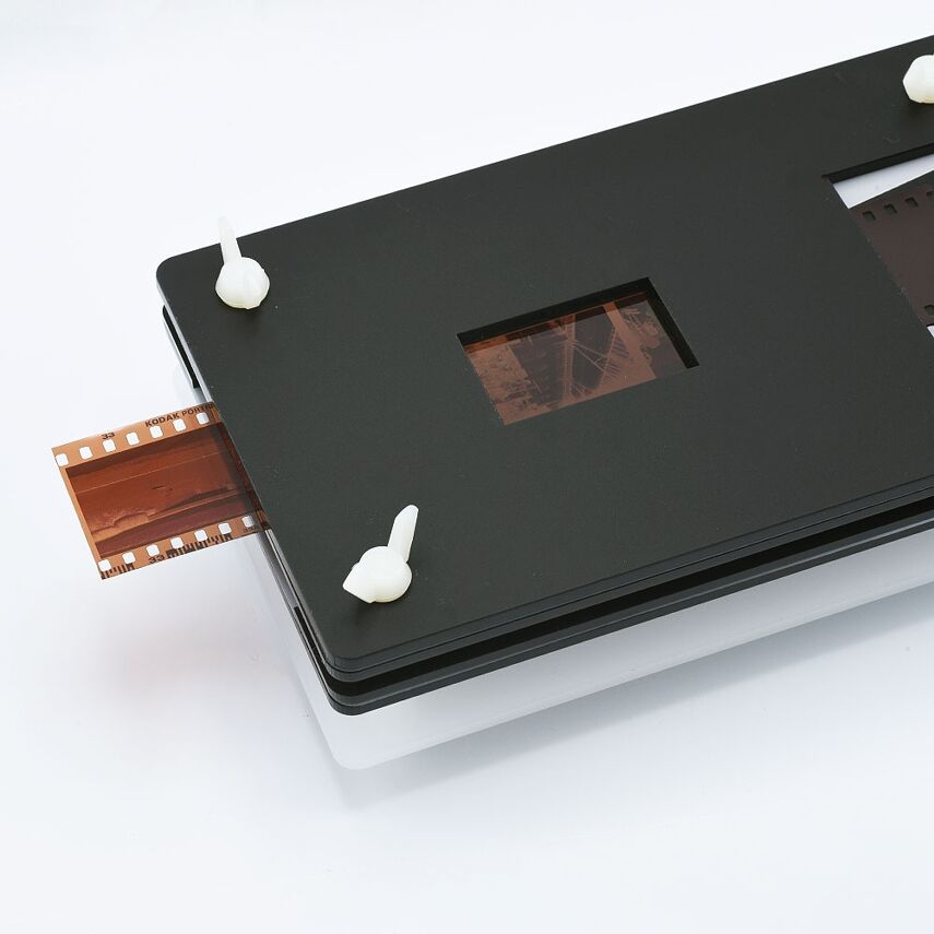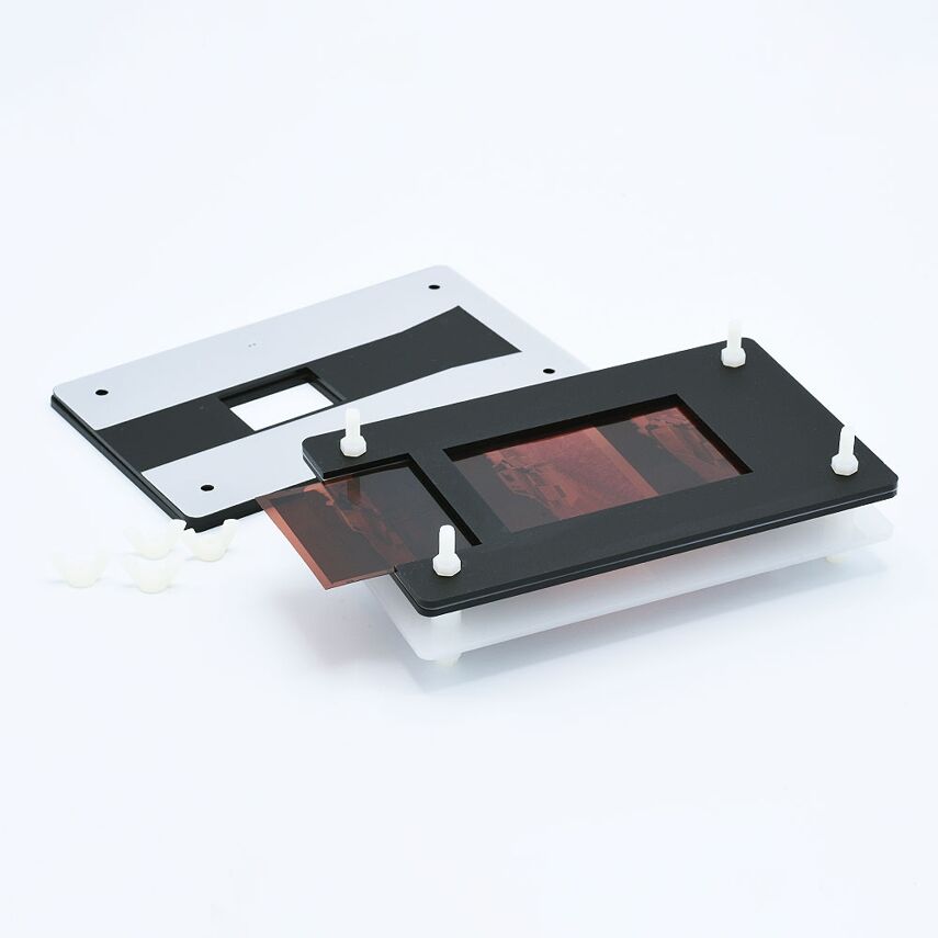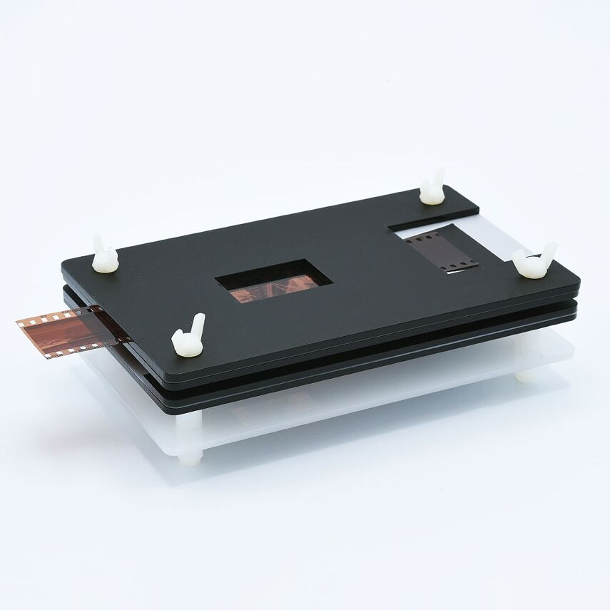 Essential Film Holder complet (version 3) avec masque de film standard pour la numérisation de négatifs de film 35mm (sans sprockets) et négatifs de film 120 (sans bordures). Le système est toujours extensible avec des masques de film en option. L'utilisation d'une boîte à lumière comme la Kaiser Slimlite est nécessaire. Le support de copie est facultatif et recommandé pour les gros volumes de films à numériser.