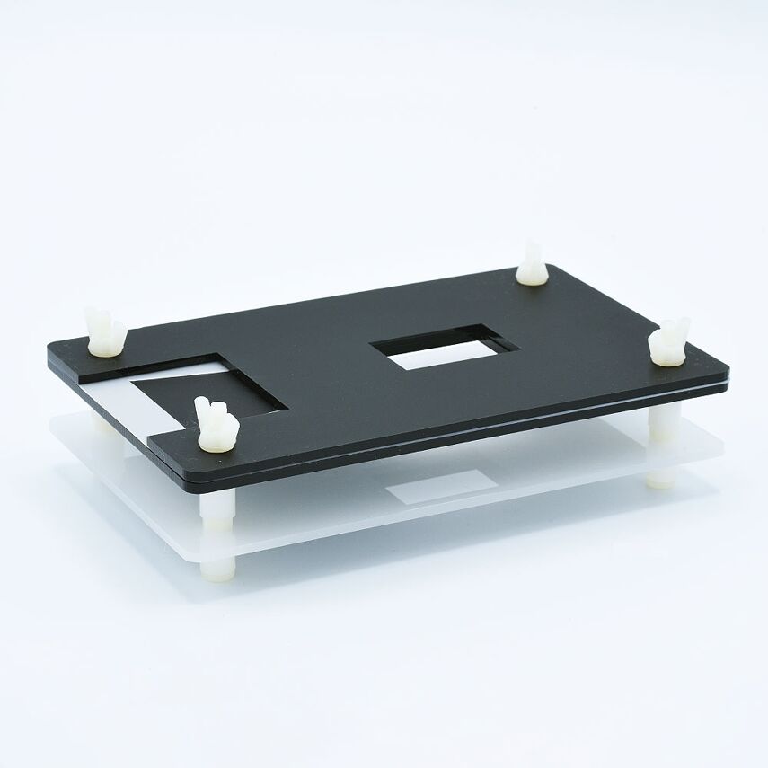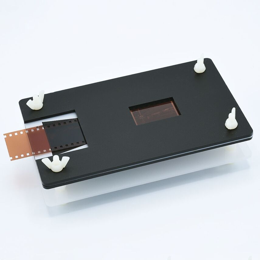 Essential Film Holder complet (version 3) avec masque de film standard pour la numérisation de négatifs de film 35mm (sans sprockets). Le système est toujours extensible avec des masques de film en option. L'utilisation d'une boîte à lumière comme la Kaiser Slimlite est nécessaire. Le support de copie est facultatif et recommandé pour les gros volumes de films à numériser.