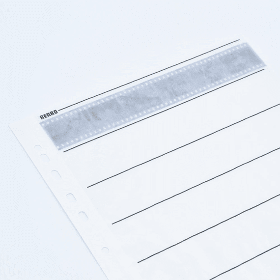 Les pages de stockage des négatifs sont en papier glassine translucide au pH neutre. Le côté perforé de la feuille est toujours fortement renforcé, ce qui évite d'éventuels dommages lors du feuilletage des différents dossiers négatifs dans la reliure à anneaux. Les différentes bandes de négatifs de la feuille sont marquées de marques noires, ce qui accélère et facilite l'insertion des négatifs.