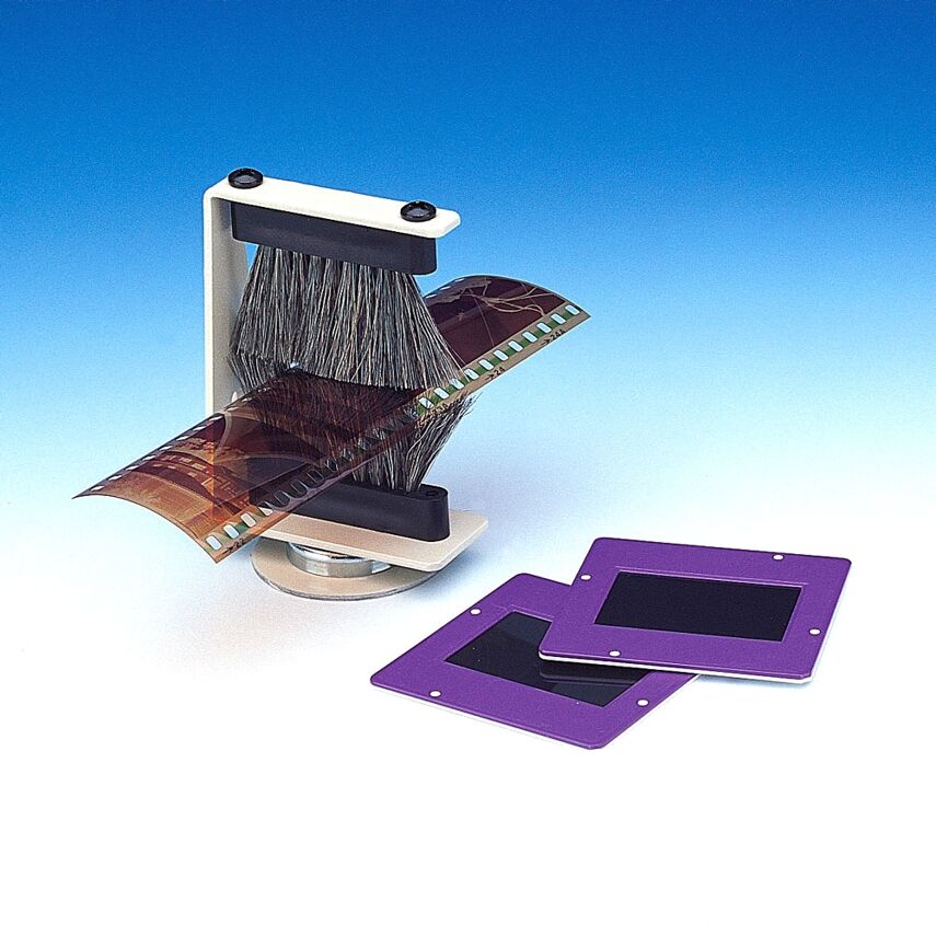 Il élimine la poussière, les peluches et les charges statiques de manière efficace et efficiente. Deux brosses antistatiques nettoient doucement le négatif ou la diapositive des deux côtés en même temps et enlèvent les charges statiques. Les brosses sont maintenues en place par un solide cadre métallique, qui peut être vissé pour une utilisation fixe, mais peut également être positionné à l'aide des aimants fournis. Les brosses elles-mêmes peuvent également être facilement retirées pour le nettoyage.