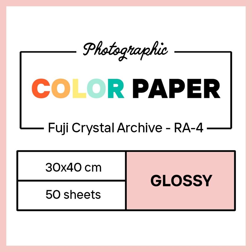 Fuji Crystal Archive RA-4 Kleurpapier gesneden in vellen uit een verse batch grotere rollen. Formaat 30x40 cm, 50 vel en glanzende afwerking.