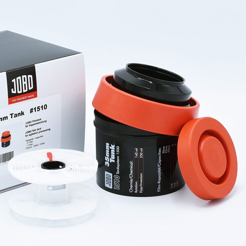 De 1510 tank wordt geleverd met één 1501 spiraal voor de ontwikkeling van één 35mm film en een standaard rood tankdeksel. Wanneer de tank met de hand wordt gebruikt voor inversieontwikkeling, moet de tank worden gevuld met slechts 250ml fotochemie, waardoor het een van de meest economische manieren is om een 35mm film te gaan ontwikkelen. Voor rotatieontwikkeling met een compatibele Jobo processor heeft de tank slechts 140ml fotochemie nodig om de klus te klaren. In dat geval moet de tank wel worden voorzien van een cog (#1505) om deze aan de lift van de processor te bevestigen of een magneetbasis (#1504) als de processor niet is uitgerust met een lift. Beide accessoires zijn niet inbegrepen en zijn afzonderlijk verkrijgbaar.