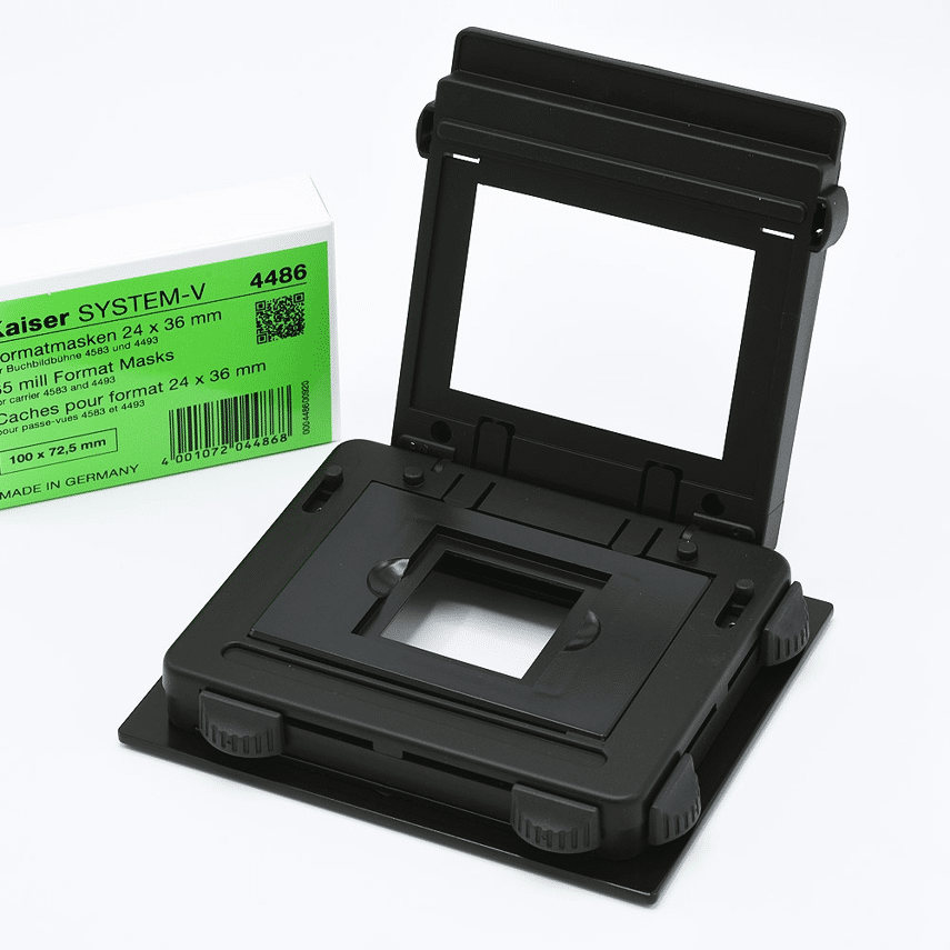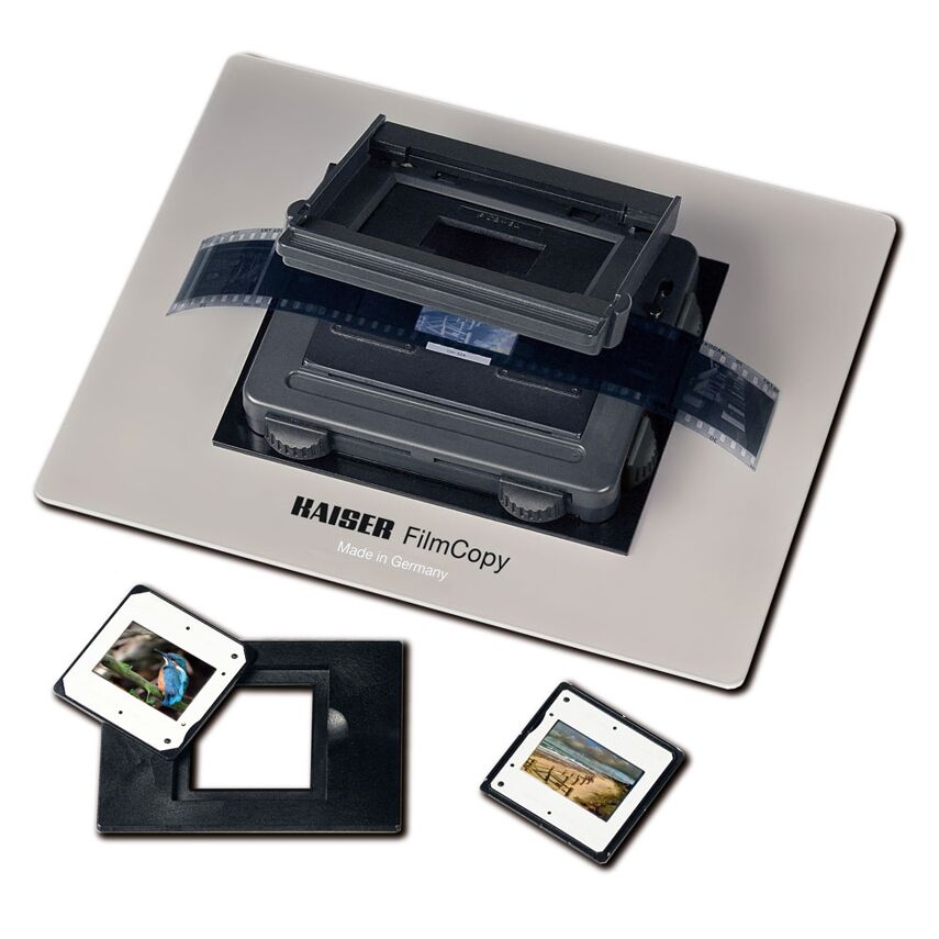 The Kaiser FilmCopy Vario is a stable holding device for the exact positioning of slides and negatives of various formats during digitization with a camera mounted to a copy stand or tripod. The negatives or positives have to be illuminated during the digitization process. For that it is recommended to use the flat Slimlite Plane light boxes from Kaiser with a minimum size of 22 x 16 cm (8.7 x 6.3 in.).