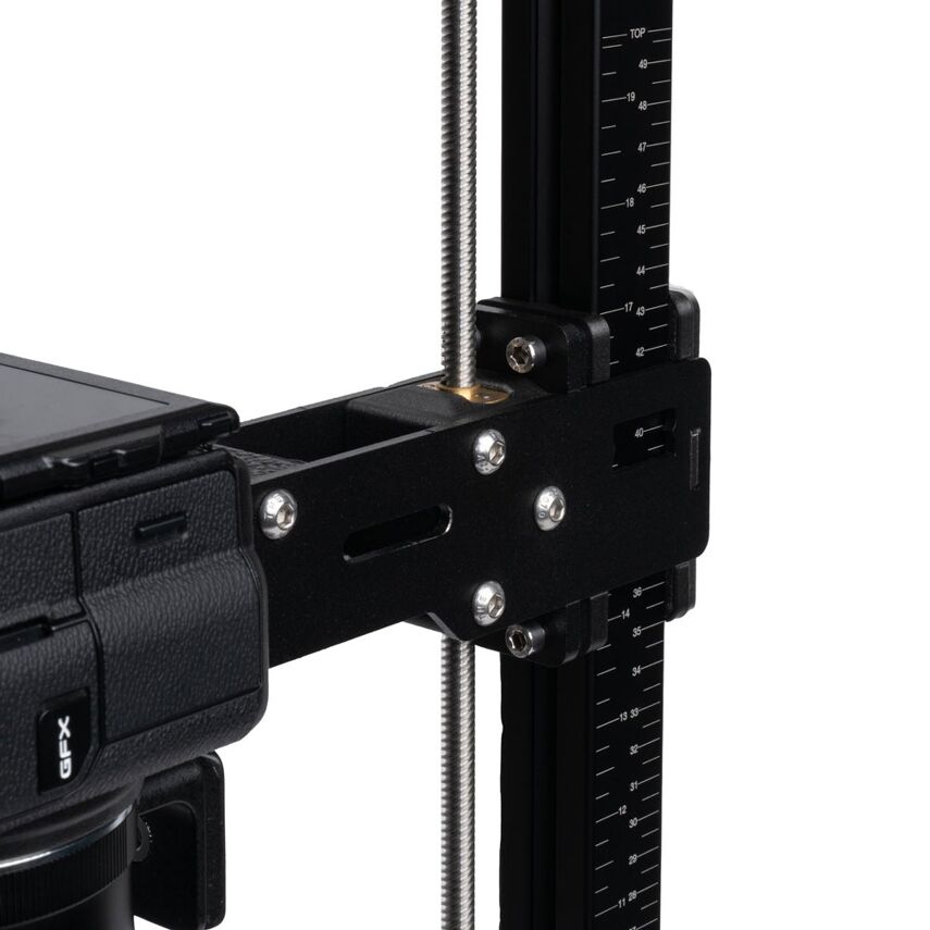 Laser gegraveerde schaal (inches en centimeters) op de riser kolom, zodat je kunt kiezen waar jouw camera moet zijn wanneer je verschillende formaten scant
