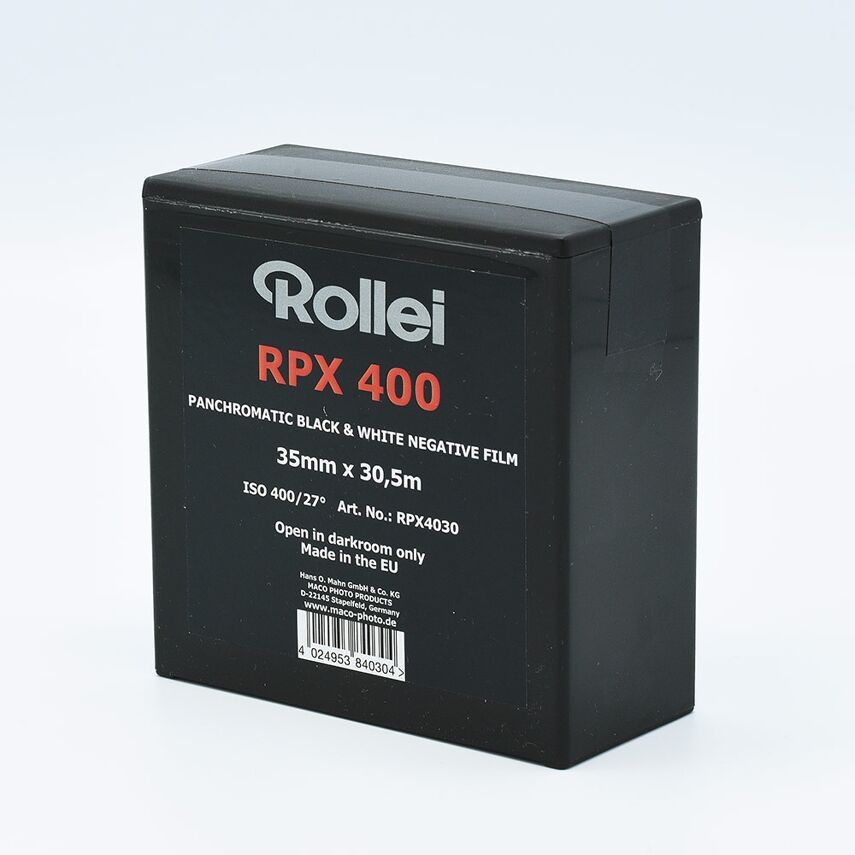 The film exhibits a nominal sensitivity of ISO 400/27° and can be developed in most black-and-white film developers. However, the film delivers best results when developed in the dedicated Rollei RPX-D film developer. RPX-D fully uses the nominal sensitivity of RPX400 and delivers high acutance and excellent detail reproduction, even when pushed.When developed at the standard development times, the film yields a characteristic fine grain texture similar to Kodak Tri-X and Ilford HP5, combined with notable sharpness and a wide tonal range.